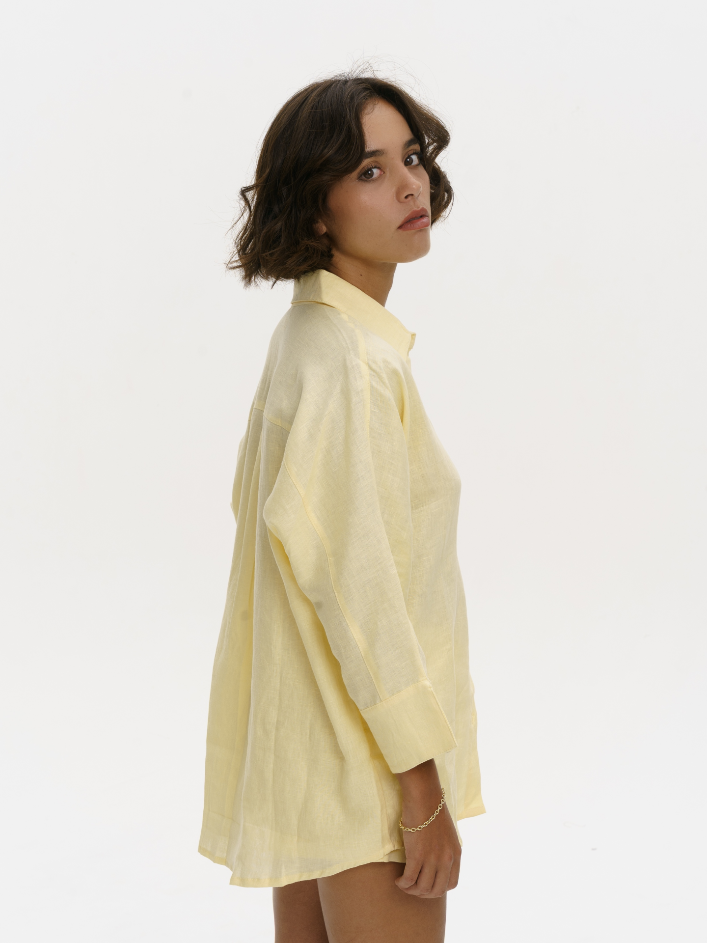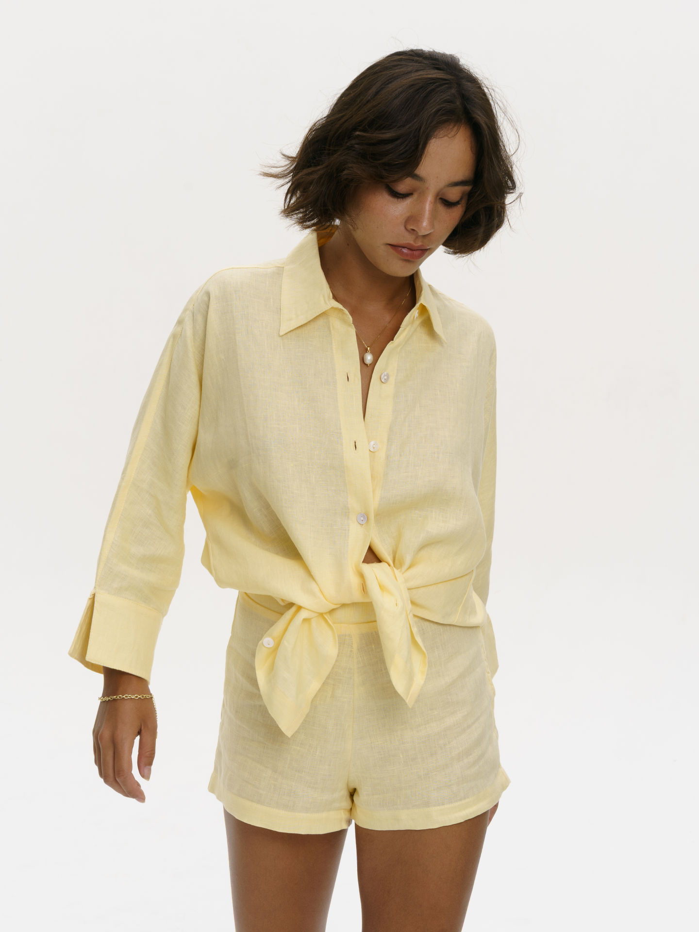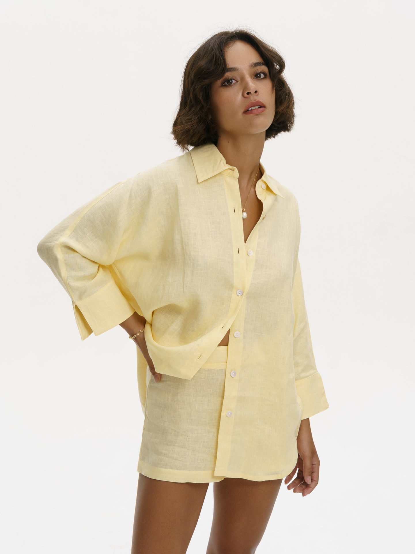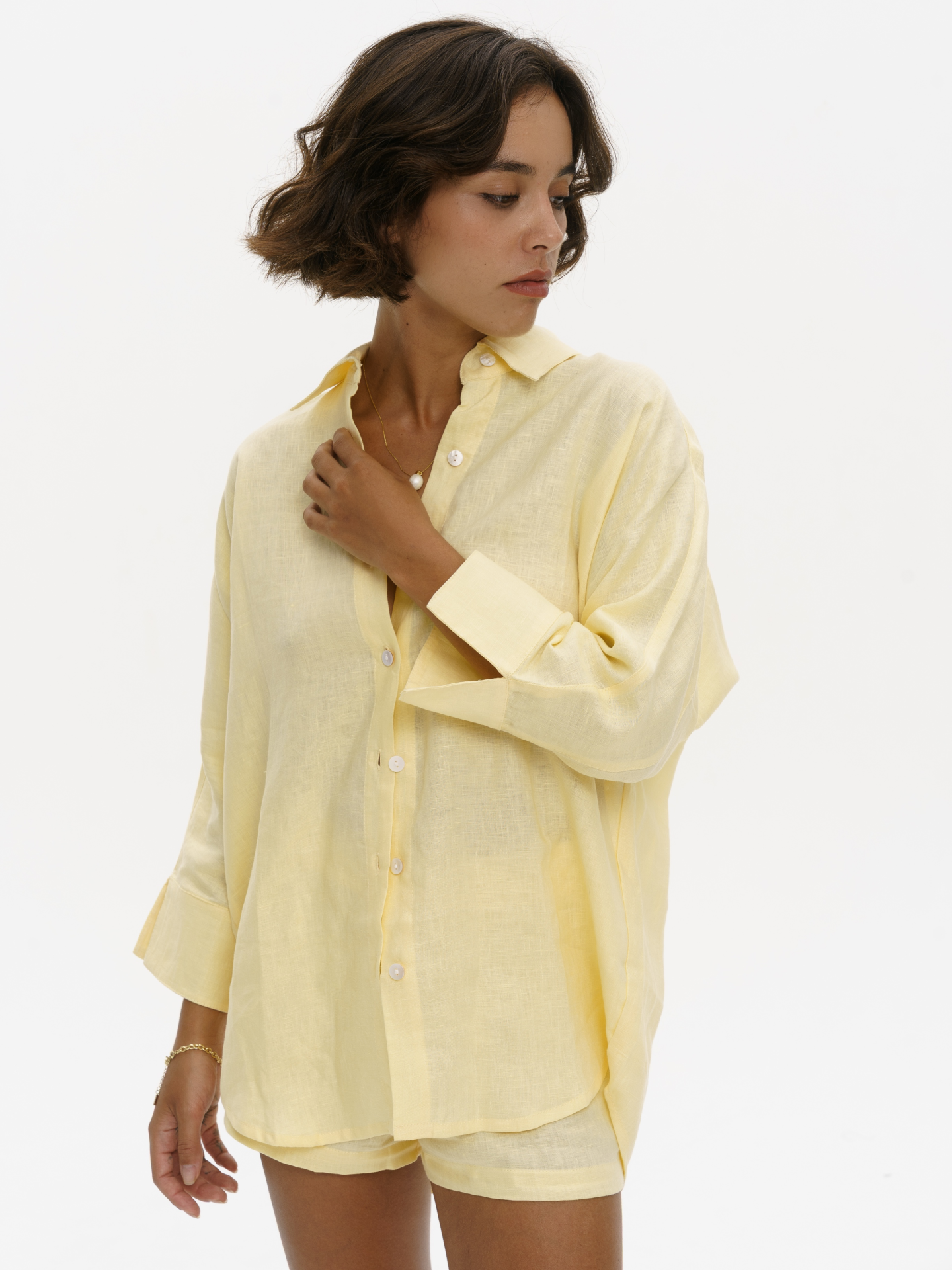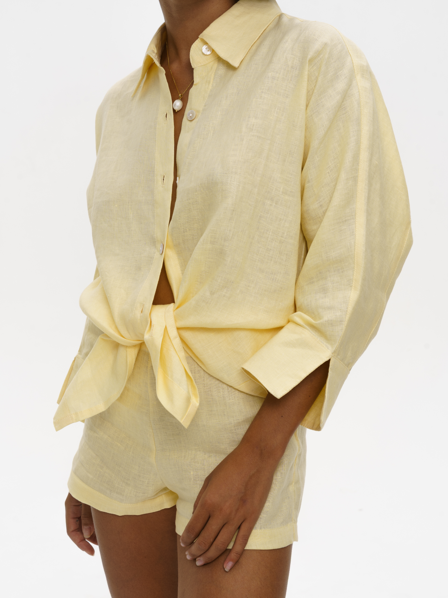 Elegant linen shirt with pearl buttons and shortened sleeve. Timeless, chic and versatile.