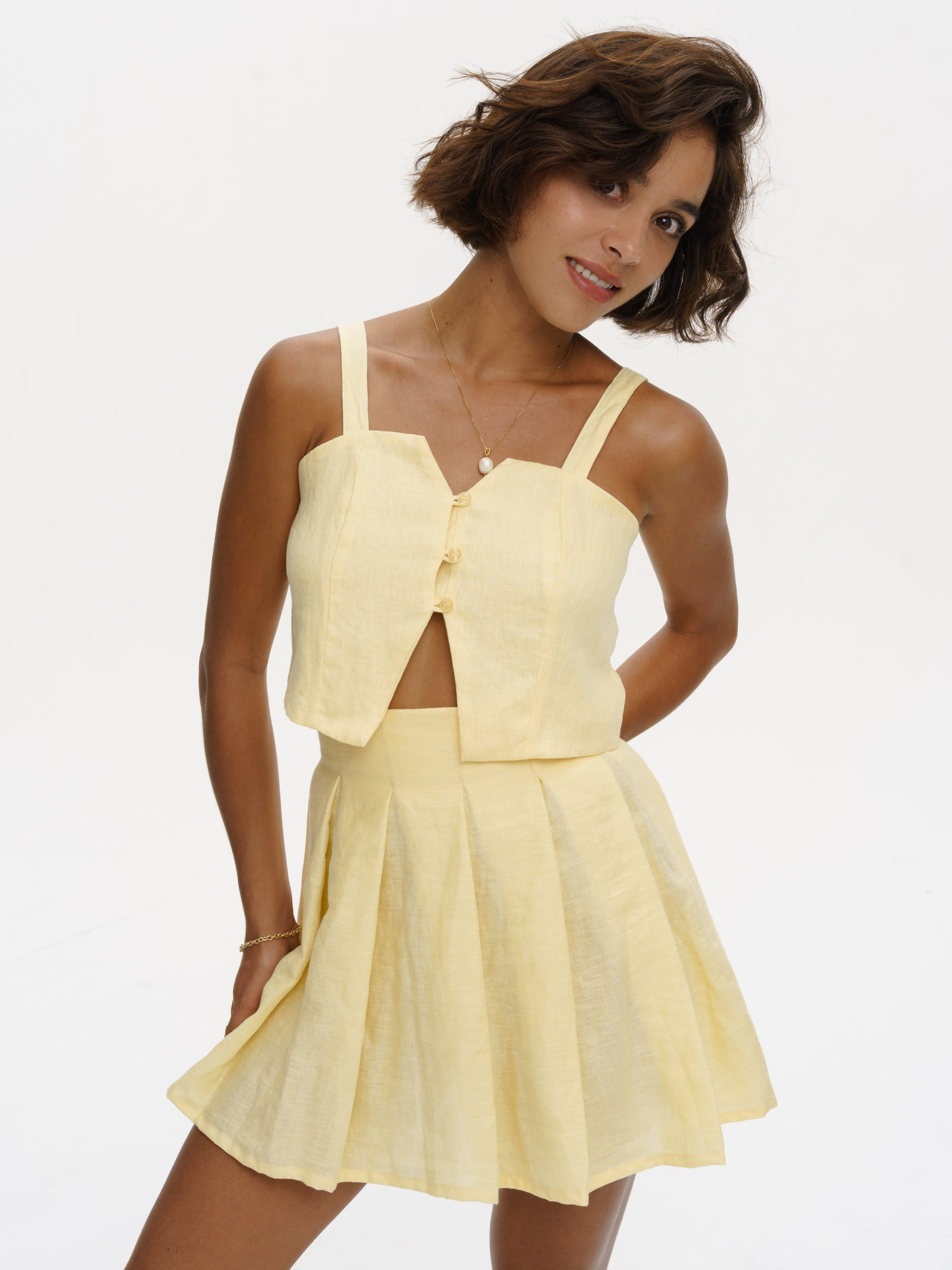 Pleated mini skirt with a high-rise fit, inspired by classic tennis silhouettes. Crafted from softened linen for easy movement and all-day comfort.